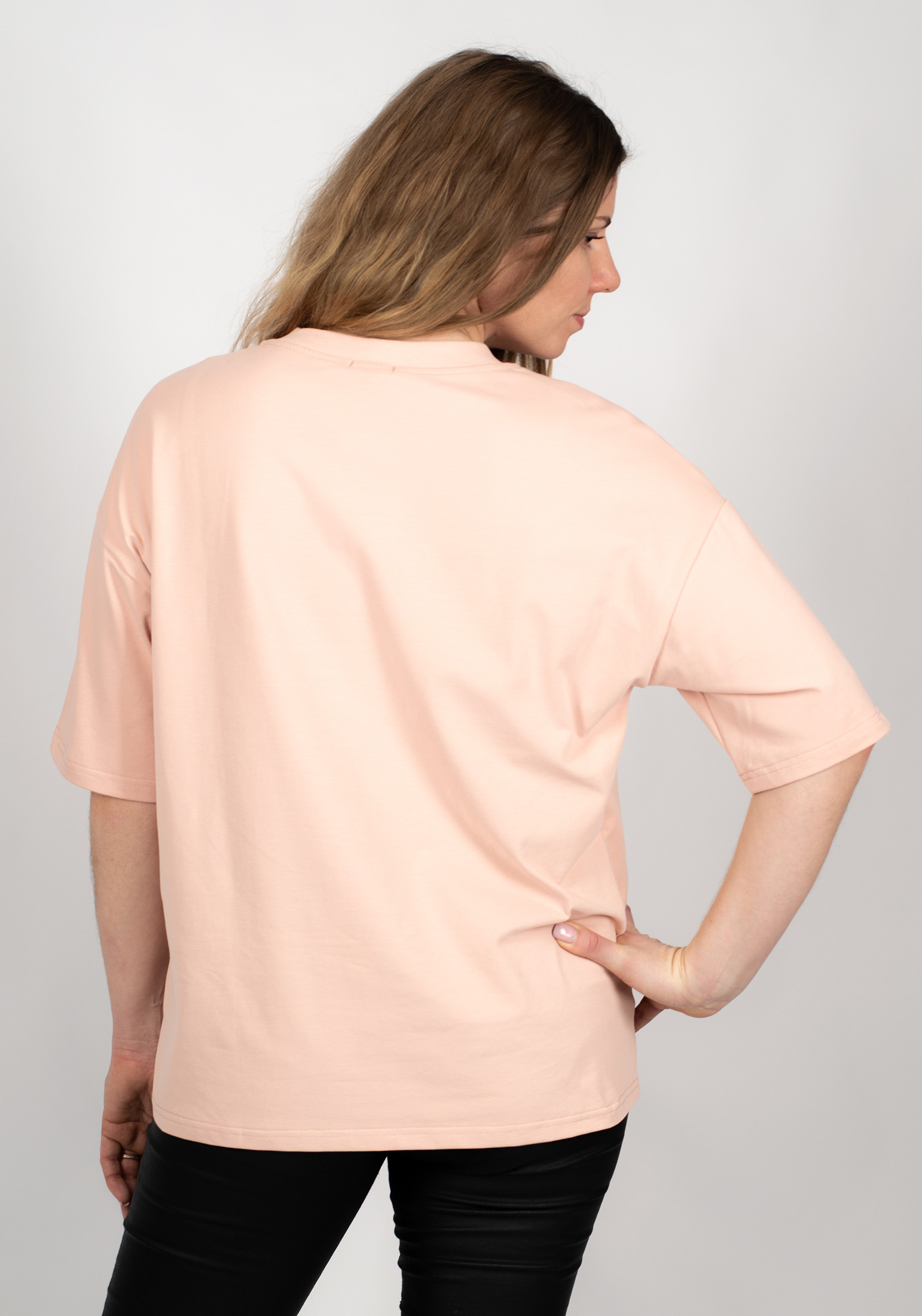Стильная базовая женская футболка из премиального турецкого трикотажного полотна в стиле OVERSIZE с peach эффектом. Модель прямого, свободного кроя, с круглым вырезом ворота и спущенной линией плеча. Женская футболка - это базовая вещь в гардеробе любой современной девушки и женщины, является одной из самых удобных, популярных и незаменимых моделей одежды круглый год, сделает образ изысканным и современным. Наши невероятно удобные футболки отлично сочетаются с шортами, джинсами, юбками, джоггерами, кюлотами. Свободный крой и элегантная форма рукавов не только придают изделию стильный и модный вид, но и гарантируют его обладательнице комфорт даже в самые жаркие дни. Футболка - самый универсальный предмет женского гардероба, который подходит под любой образ, от строгой классики до спортивного стиля. Гладить с изнанки. Стирка при t не более30С. Деликатный отжим, отбеливание запрещено